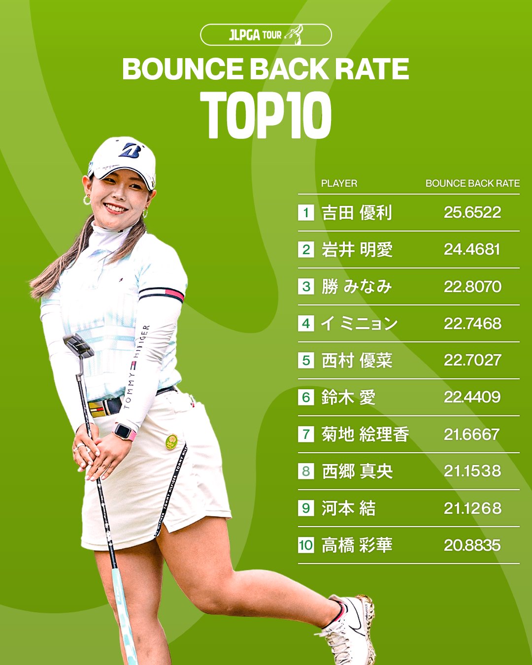 日本女子プロゴルフ協会 Jlpga On Twitter Stats2022 2022 Jlpgaツアー バウンスバック率 Jlpgaブライトナーによる女子高校生ゴルファー向けのイベントで ミスをした時は 悔しいという感情を起爆剤として残し 次のホールにぶつける と語っていた 吉田優利